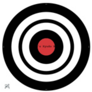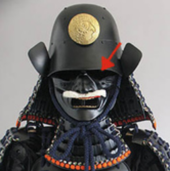 金的」在日本稱為「きんてき(Kinteki)」或「きんのまと(Kin-no-mato)」,其由來更是眾說紛紜,其尺寸當然也各有不同。其中一說是指古代戰場中,武士在穿著甲冑時未被保護的眼睛部分(如下圖箭頭處),就直徑尺寸上來說大約一寸八分(約3.3cm)(約5.5cm:感謝 FB Watanabe先生的指點)。此種類的甲冑一般只有領軍者或六品以上武官才會著上,故能射中可謂難得並可贏得戰功。延伸至現代,此類「金的」使用在祝儀上更顯其”難能可貴(めでたい)”之精神。另外兩種說法是指男性的睪丸部位及現代版標靶的中心處(如下圖紅色部位)。就直徑尺寸上來說大約三寸(約7-8cm)。不過不管是哪一種類型的「金的」,在現代皆屬於祝儀上所使用的標靶,總之射到都很爽(喂!!!)
