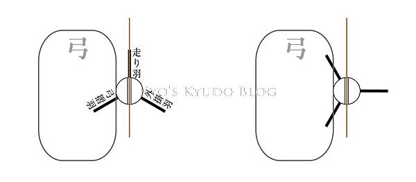 不曉得各位是否有特別留意過箭羽毛的方向呢?在弓道界中常見的有以下兩種,又特別以圖左最為常見。若是從羽毛的順序及名稱以順時針來介紹起分別為「走り羽(Hashiri-ba)」;「外掛羽(Togake-ba)」;「弓摺羽(Yuzuri-ba)」又稱「頬摺羽(Hōzuri-ba)」,如下圖般,在視覺上與弓身重疊,故有此名。不過這可能讓不少讀者想到為什麼要這麼設置呢?這樣不就更容易讓羽毛毀損嗎?其實不然!同樣的,只要勤於練習,手の内與離れ能更自然地呈現後,我們那漂亮的箭羽便不容易毀損,所以說技術更是保養弓具最重要的一環!當然,如圖右「二枚頬摺羽(Nimai-hōzuri-ba)」般的做法,供各位參考(這樣的模式反而常出現在各國傳統弓界。但購買時也請不要向弓具店老闆說:老闆~你的筈裝歪囉……….)。