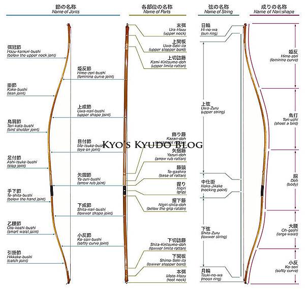 閱讀下文前,煩請先確認下圖之「末弭」、「鳥打」、「目付節」、「本弭」等各部位之名稱及正確位置。