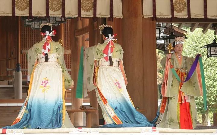 首先是侍奉神明的工作,其中最主要的,便是在各種節日或儀式上大家看到的「巫女舞」了。巫女舞又稱巫女神樂(音勒),即讓神愉悅快樂的舞蹈。常見的是全國統一的神前神樂,如以扇子和鈴鐺為道具的浦安舞(うらやすのまい)、以楊桐枝或花束為道具的豐榮舞(とよさかまい)這一類觀賞性很強的現代編制的舞蹈。