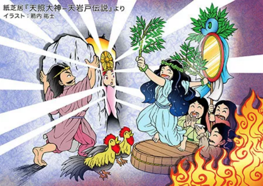 傳說在眾神生活的高天原上,有一日,太陽神天照大御神被中二又淘氣的弟弟須佐之男氣得不行,躲在了名叫「天岩戶」的大石頭後面不肯出來。世間沒有了太陽普照,頓時陷入了黑暗。其他眾神十分著急,聚在一起討論,想出了一個辦法。