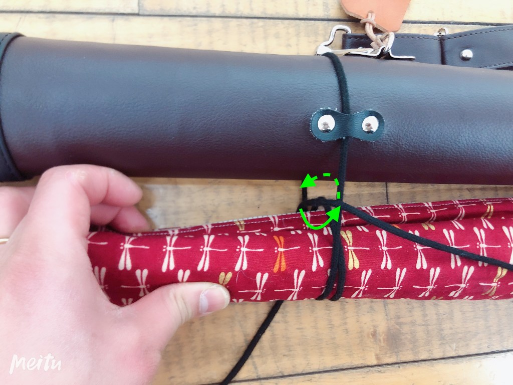 其後兩繩分別在穿繞在弓身與箭筒的兩繩之間,將其繫緊。外觀上來說的話感覺就像是個八字形(∞)。當然,可能會有朋友說:那直接綁成八字形不就好了嗎?各位,這樣一來的話,使用時會一直往下滑……..。