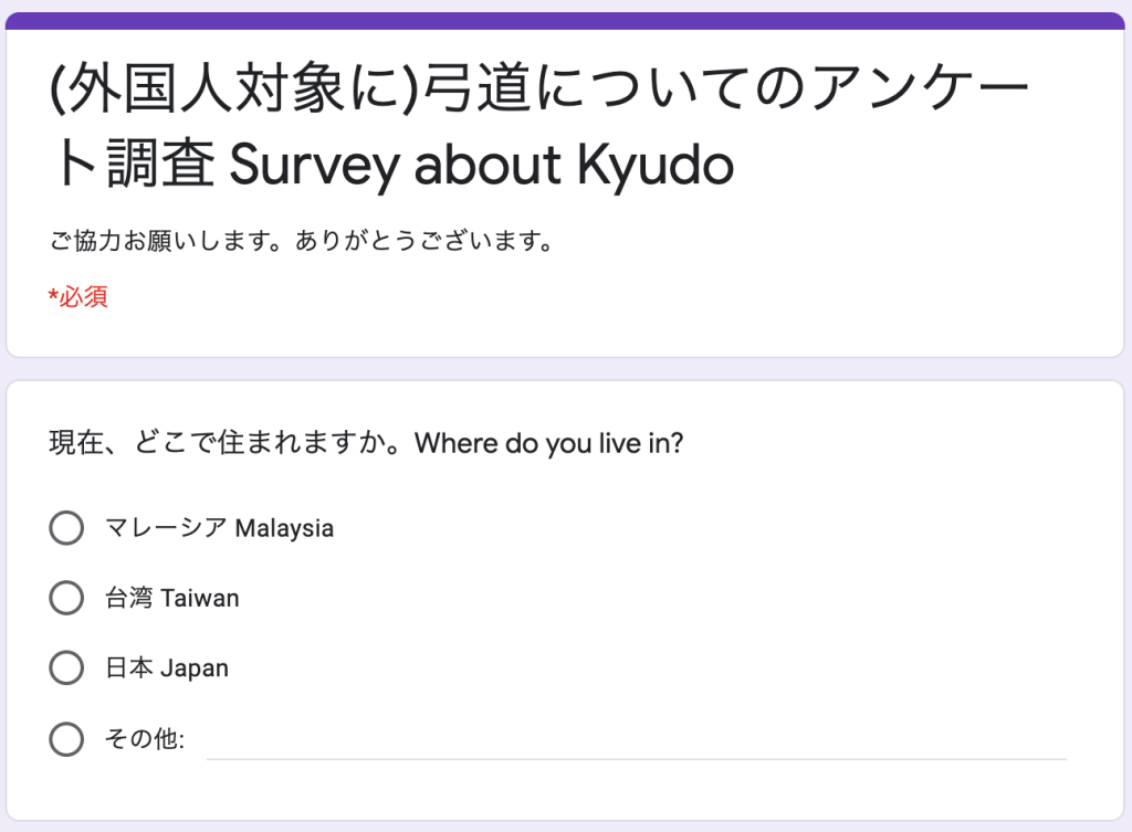 其他 (外国人対象に)弓道についてのアンケート調査 Survey about Kyudo By Kyo桑 on 2020-06-14 • ( 發表留言 ) https://forms.gle/Ej84eRYErbi2DMjv8 這是一位馬來西亞弓道友的朋友所做的弓道相關問卷,麻煩各位多多幫忙喔! 探索更多來自 許桑的弓道雜談 的內容 訂閱即可透過電子郵件收到最新文章。 輸入你的電子郵件地址… 訂閱 分享 按一下以分享至 Facebook(在新視窗中開啟) Facebook 按一下即可分享至 X(在新視窗中開啟) X 按一下即可分享到 Threads(在新視窗中開啟) Threads 按一下即可以電子郵件傳送連結給朋友(在新視窗中開啟) 電子郵件 點這裡列印(在新視窗中開啟) 列印 喜歡 正在載入... 相關 分類:其他 Tagged as: アンケート, 問卷