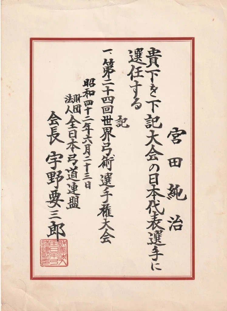 在日本反曲弓界人士的努力下,持有國際射箭競技參賽權的全日本弓道連盟又再次計劃參加國際賽事。於1967年7月在荷蘭舉辦的世界射箭錦標賽上,宮田桑以唯一持和弓參加的選手登場,但最終在弓具的落差上惜敗而歸。此後不久,國際賽事的參賽權被移交到全日本射箭連盟。