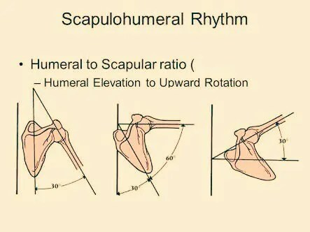 手臂與肩胛骨的運動量比例為2:1。換句話說,當我們將手臂抬起時,看似手臂上抬約90°,但實際上是手臂抬起了60°,另外30°是由肩胛骨的移動產生。