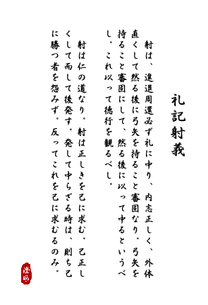 在北京澄明弓道場有個習慣,就是在每次練習前的行禮時,會全體正座朗讀「禮記 射義」「射法訓」。