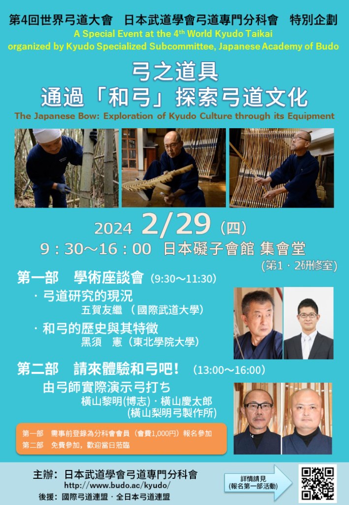 第4回世界弓道大會 日本武道學會弓道專門分科會 特別企劃 【透過「和弓」探索弓道文化】。世界弓道大會2024年2月29日當日於日本ガイシフォ-ラム第1、2研修室舉行。