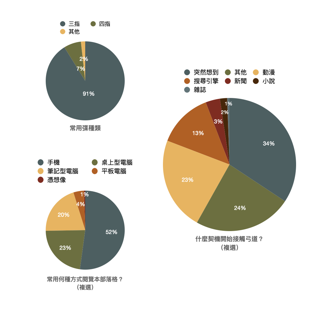 由下圖左上可知,在Kyo桑或多或少覺得「四指弽」使用者好像多了不少,但就結論來看,多數的射手還是使用「三指弽」,約佔了91%。此外,Kyo桑雖然希望多數讀者以電腦閱覽,但由下圖左下看出「手機」這52%的比例,往後Kyo桑的排版方式要多以手機為主了,還真有點不容易啊(苦笑)。