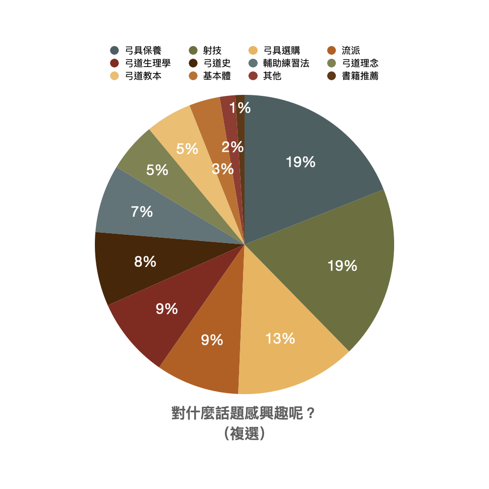下圖是「對什麼話題感興趣」的結果。說實在的,That’s a shock! 從「射技」的角度來說,包含「弓道生理學」「輔助練習法」共占35%,這也剛好跟此部落格內「射技」相關文章的佔比類似。但一直以為「射技」會是拔得頭籌,結果前三強中居然「弓具保養」與「弓具選購」佔了32%,而「流派」這話題也意外地占了9%。看來接下來應該要增加「弓具保養與選購」以及「流派」相關文章(可能會因此稍微某些人嫌…)。