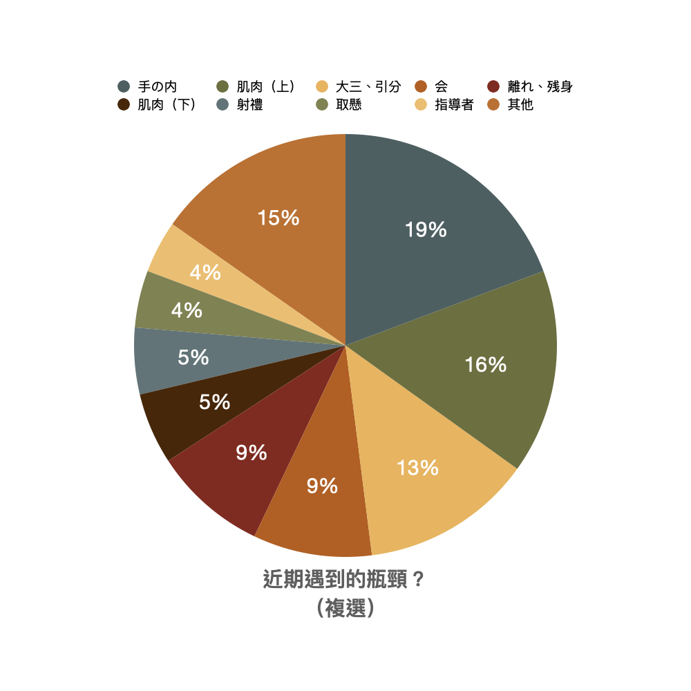 下圖是「近期遇到的瓶頸」的結果。果然,「手の内」是一輩子的課題!其他就是令人不意外的「肌肉使用方式」以及「大三、引分」、「会」等果然還是上位。另外想是「心態」、「猿臂」等比較冷門卻又相當常見的話題,看來也是有琢磨的必要。(其實已有寫過「猿臂」相關話題,可以先參考 這裡)