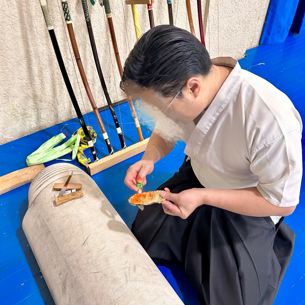 現市面上的「くすね」多分為夏、冬兩種形式(管狀)(僅含油量差異),將少許「くすね」塗抹至「わらじ(waraji;草鞋)」上,直接摩擦塗抹至麻弦上即可。以下是Kyo桑在保養自家弦時,身邊的弓友胡亂拍的,希望能帶給各位參考價值……..⬇️ 此外,刷上「くすね」時請由上到下喔!至於刷到什麼程度,還請自行拿捏👍(總之Kyo桑會刷到有包漿感)