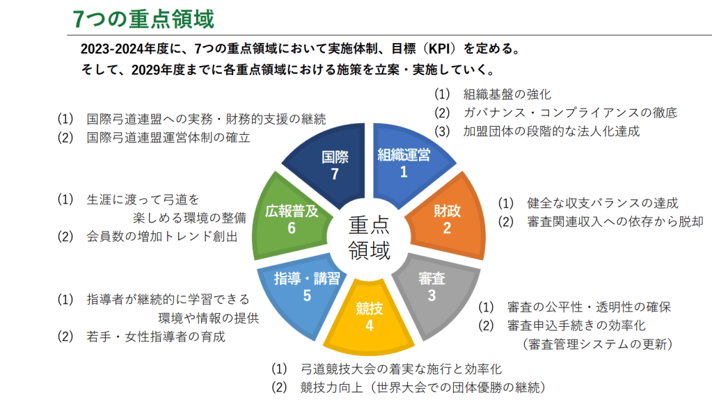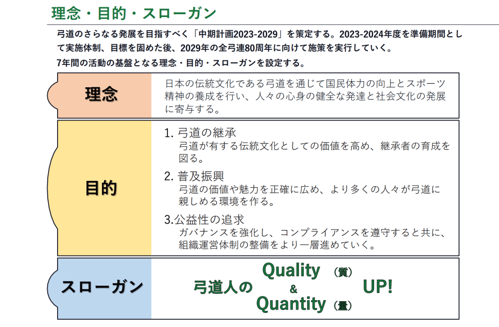 「中期計画2023-2029」將2023-2024年訂立為準備期間,確保組織體制實行,針對2029年全日本弓道連盟80週年紀念進行準備。以下為接下來七年的活動理念、目標以及標語。