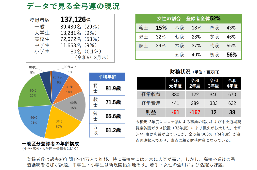 根據2023年3月統計報告,現有登錄者數(僅全日本弓道連盟)為 137,126名。當中成人 39,430名(29%)、大學生13,281名(9%)、高中生72,672(53%)、初中生 11,663名(9%)、小學生 80名(0.1%)。(Kyo桑備註:全日本弓道連盟中大學生人數之所以較少的原因,是因爲絕大多數大學生弓道部登錄於全日本學生弓道連盟內。全日本學生弓道連盟並非隸屬於全日本弓道連盟。現(2023)登錄人數 10,865名)