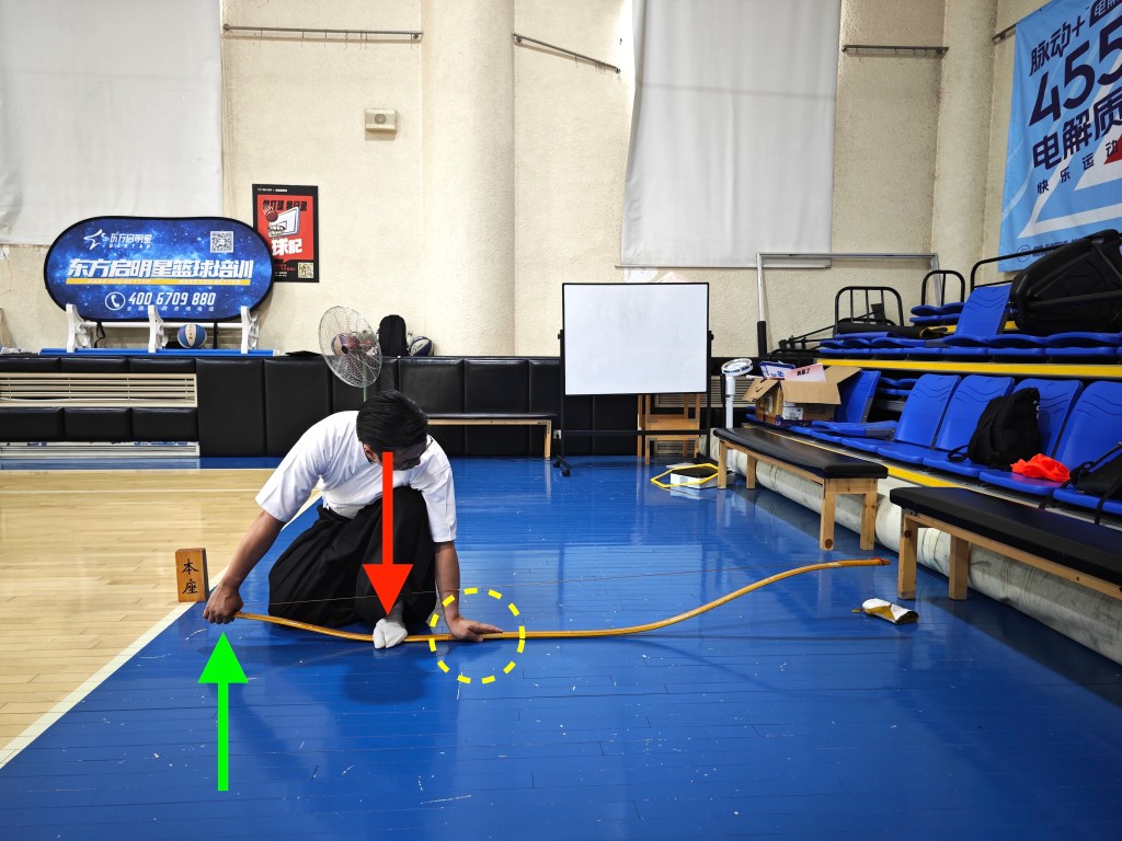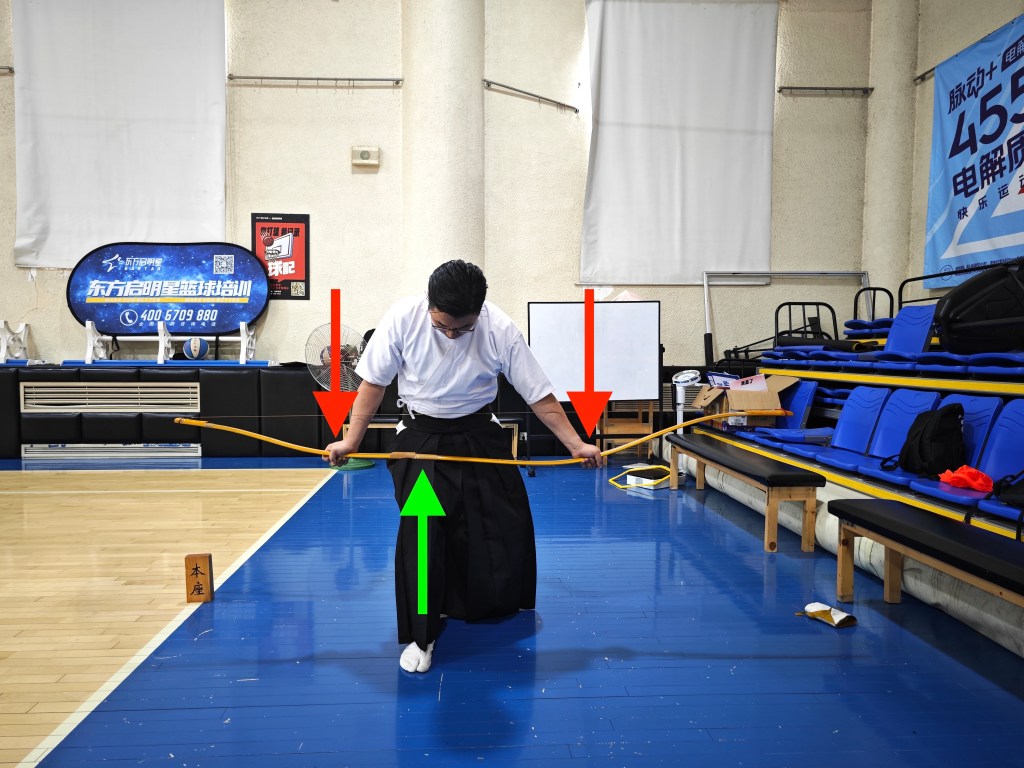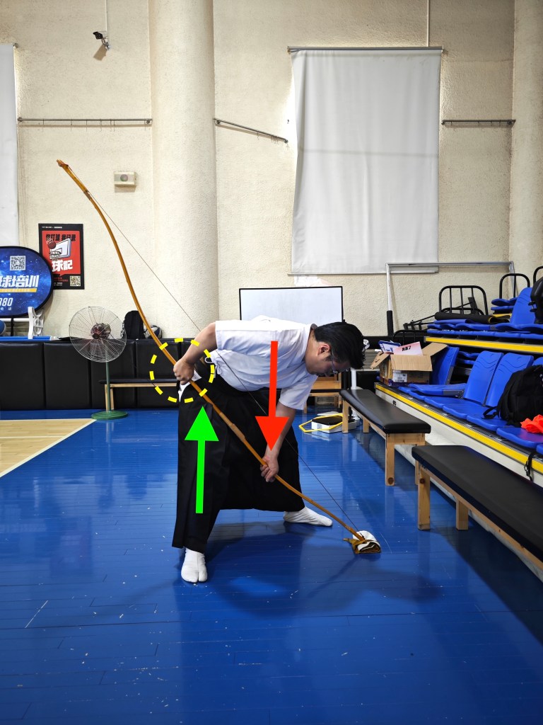 如上,若認為胴(弓身)曲度較小,另有個方法是以左手固定握把處,以右腿支撐小反附近,右手握持下成節處,適度下壓。大約維持一分鐘後,再次確認弓形是否有改善。