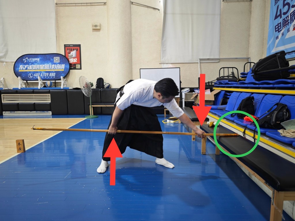 如上,若怎麼調適都沒什麼改善,可試試上圖方式。以左手固定目付節處,右腿頂著足付節,右手握持下成節處,適度將身體下沈。大約維持一分鐘後,再次確認弓形是否有改善。此時一定要謹慎,反則相當容易造成弓身損壞。