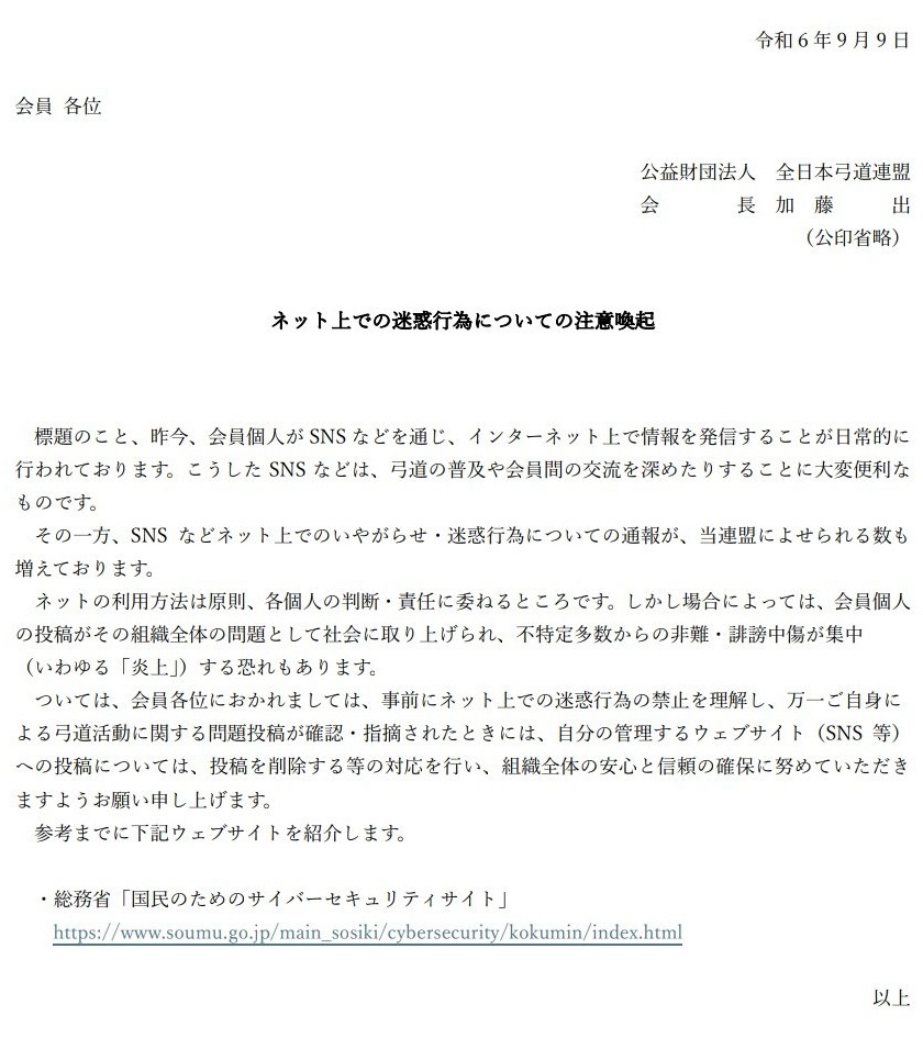 本篇想分享於2024年9月9日由全日本弓道連盟現任會長 加藤出的一封公開信《關於網路上迷惑行為的注意事項》。