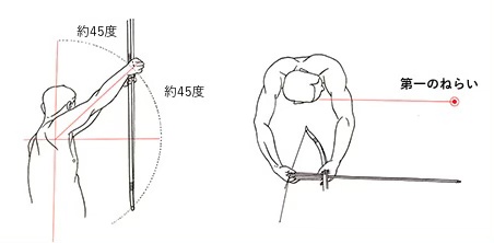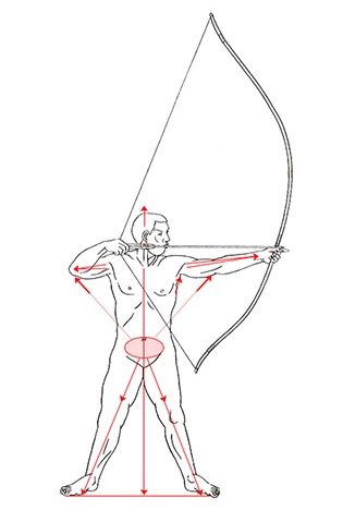 以「矢束」為基準,雙腳呈外八字(約60度)張開,雙腳拇指前端對齊,使其與靶中心成一直線。