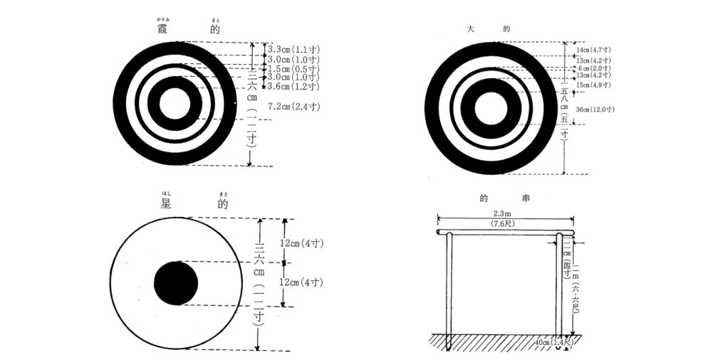 亦稱為「遠的」。直徑1.58公尺(約5尺2寸),行射距離為55~90m(約30~50間)。其規格如下圖所示。