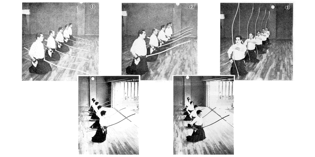 (二)進行「弓倒し(yudaoshi)」時,須注意不要打到前方射手的頭部。應配合「息合(iki-ai;呼吸節奏)」,平穩且優雅地將弓放倒至身側。