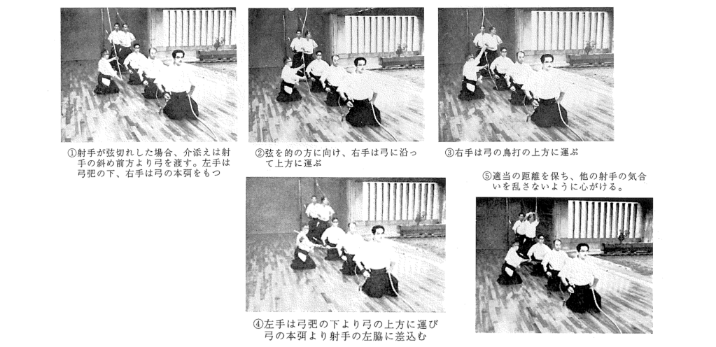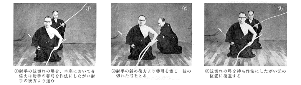若弦在行射過程中斷裂,若弦落在身邊,應朝其方向將腳靠攏後跪坐,或以膝行方式拾起弦。若弦飛到較遠處,同樣先將腳靠攏,步行至落弦處,跪坐後拾起弦。拾取時,將箭移至左手後,以左手拾起弦,用右手將其纏繞收好。回到射位時,左手握持著弓、弦,再將箭拿回右手。同時應顧及周圍,表以歉意,迅速且有禮地退至射位。