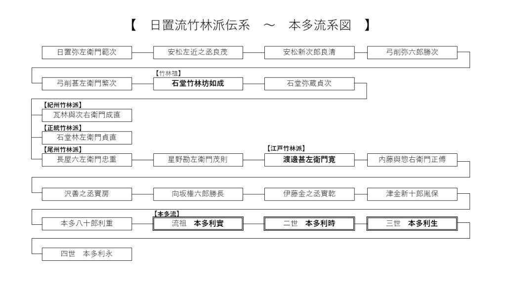 | – | 本多利重(流祖 本多利實之父。德川幕府的旗本,本多家初代利友起算第12代),自日置流竹林派家元 津金新十郎胤保手中繼承宗家 | – |