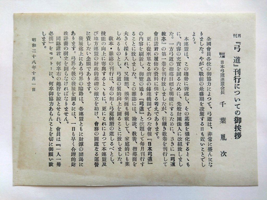 此外,本聯盟決定對以往僅作為資訊傳遞工具的會報《日本弓道》進行內容革新,並如各位所見,更名為《弓道》,改為月刊定期出版。本誌將廣泛收錄論說、教養、指導等內容,同時也包含隨筆、娛樂等專欄,使其成為家庭中亦能輕鬆閱讀的刊物,藉此提升弓道的整體素質。