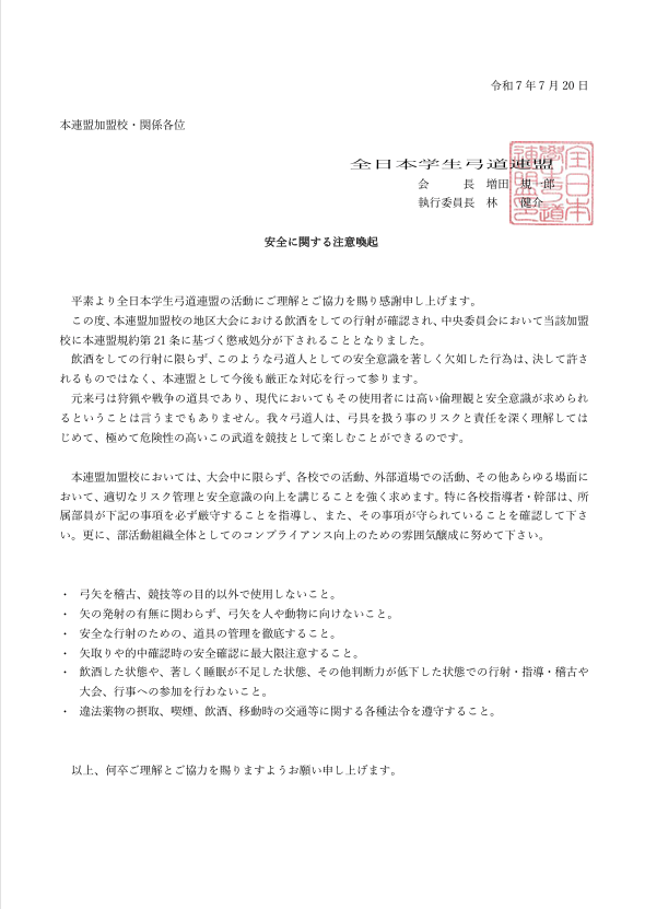 不僅限於飲酒射箭,任何作為弓道人卻嚴重欠缺安全意識之行為,皆不可被容忍。對此類事件,本聯盟今後亦將持續採取嚴正對應。