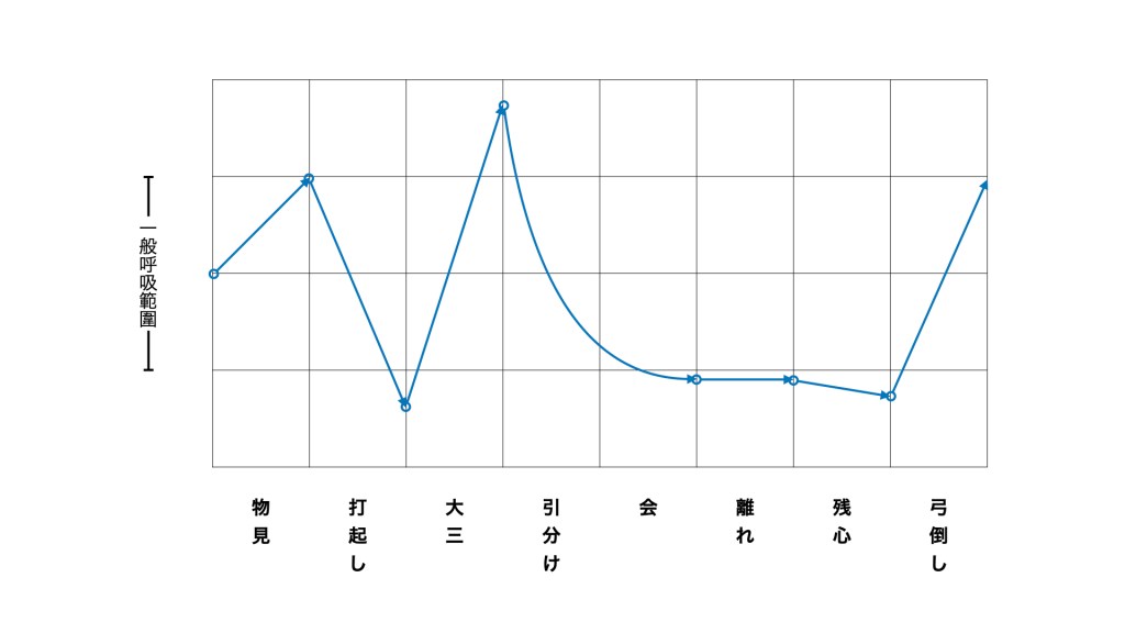 至今拜讀過的弓道著作與論文之中,鮮少有明確談及此類話題的內容。今天,Kyo桑想分享的是已故山本老師所傳授的呼吸法(如下圖)。或許這與各位平時的習慣或理解略有不同,但呼吸之法暫時無所謂對錯——或者說,只是沒有人敢輕易下定論罷了。