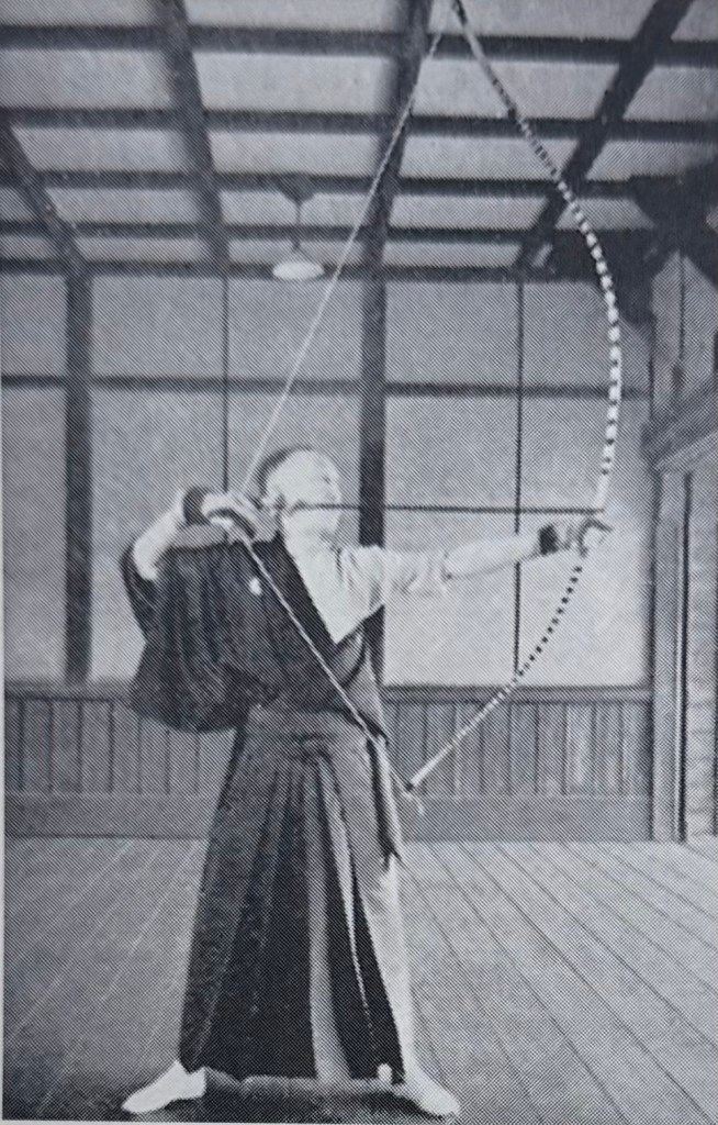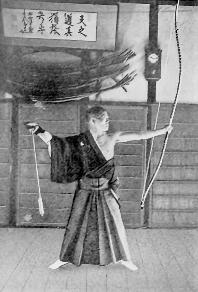 只盯著靶看,注意力便會被靶牽制。若能透過左拳去看靶,靶自然會向手邊靠近。重點在於抱持著將靶引向自己身體的心理狀態,也就是把注意力收回到身體,讓意識安定於身體中心。所謂以「心眼」看靶,指的正是這種運作方式。