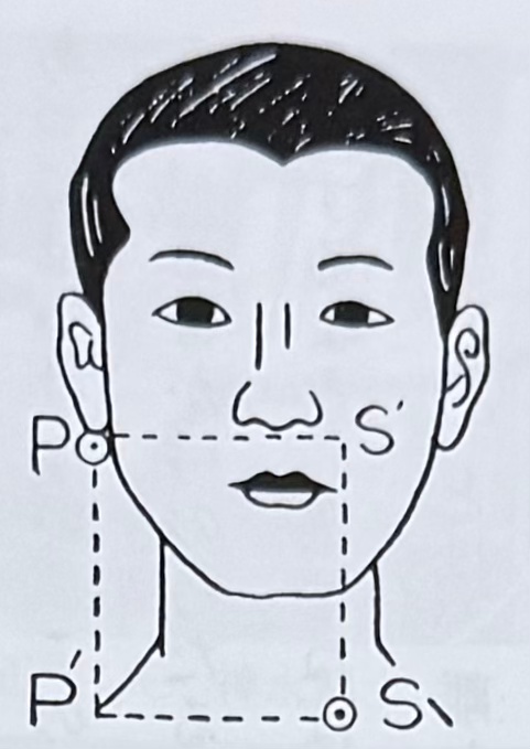 如上圖所示,若思考「会」時弓矢與身體之間的受力關係,以雙肩骨(S)作為支點,將包含此 S 的水平面,與自「頬付け(臉頰)」位置的矢(P)所下垂直線的交點定為 P;再將包含 P 的水平面,與自 S 向該平面下垂直線的交點定為 S’。如此一來,在「会」時,力量便以 PS’ 與 PP’ 這兩個力的合力方向,也就是 PS 的方向作用,並取得平衡。此一名為 PS 的力量方向,理應存在於「打起し」的平面之內;因此,在進行「打起し」時所舉起的矢,也必須位於 PS 延長方向所形成的平面之中。
