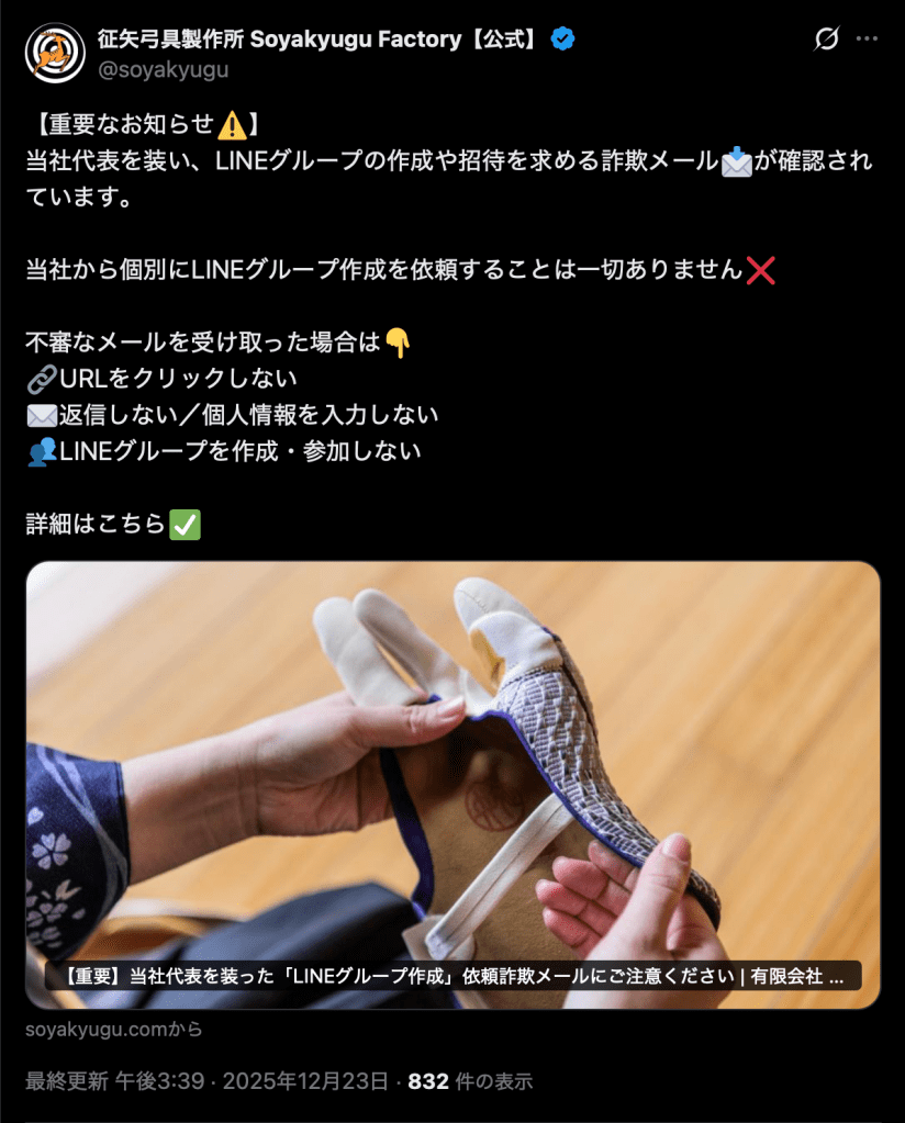 目前已確認有不肖人士冒用本公司代表者名義,寄送要求建立或加入 LINE 群組的可疑郵件(詐騙)。此類聯絡與本公司毫無關係,本公司亦從未、也不會個別要求任何人建立 LINE 群組。如您收到類似郵件,請務必遵守以下事項。為防止詐騙受害,請務必注意以下幾點: