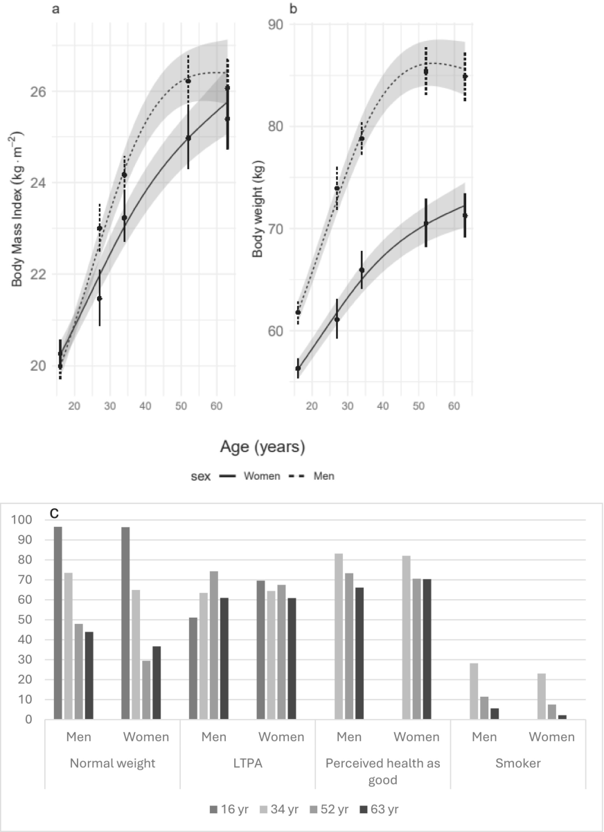 BMI 與體重的年齡變化趨勢、各年齡階段相對於標準體重的比例、休閒時間身體活動量(leisure-time physical activity, LTPA)、自評健康狀態,以及吸菸比例等。