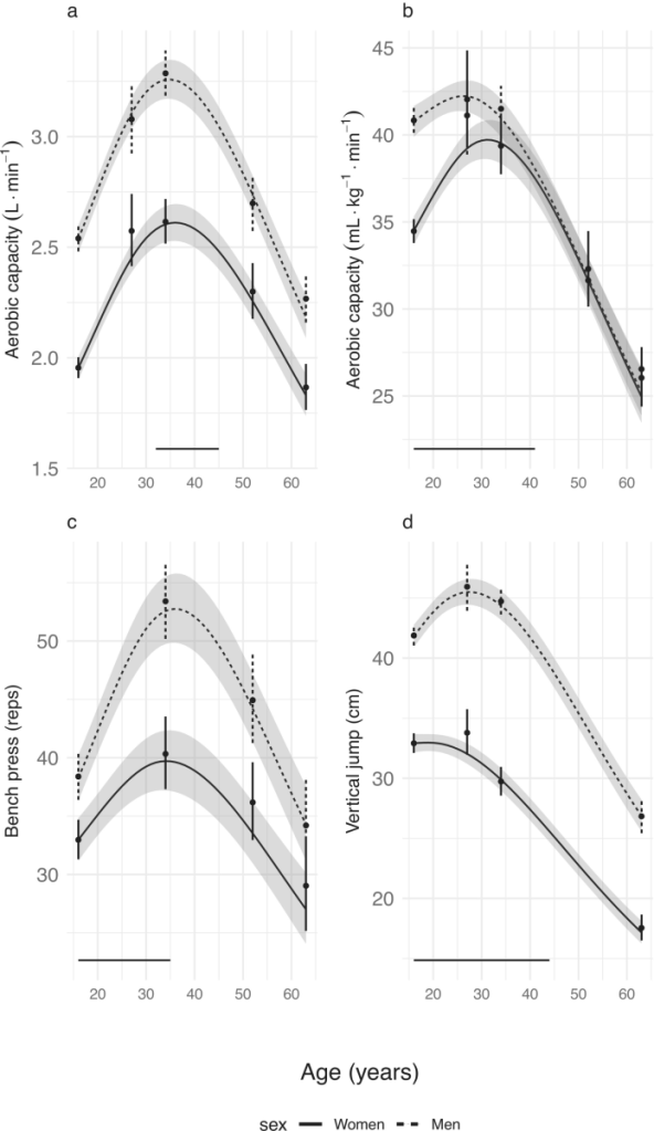 基於這樣的問題意識,瑞典的一個研究團隊針對並非長期從事高強度身體活動(如職業運動員)的一般人群,展開了一項長達47年的縱向追蹤研究,試圖從長時間的實證資料中,釐清人體各項身體能力隨年齡變化的實際樣貌。